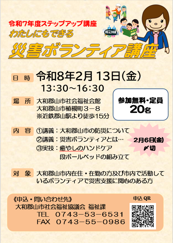 | 対象者 | 市内在住・在勤の方、大和郡山市内で活動しているボランティアで、災害支援に関心のある方 |