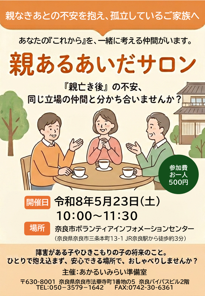 | イベント内容 | あかるいみらい準備室では、親亡き後の相談窓口として、 これまで多くのご家族の親なきあとのご不安をお聞きし、 さまざまなサービスや制度へつなぐサポートをしてきました。 今後は、知識の提供だけでなく、 ご家族の『心の拠り所』となる場所を作りたいと考え、 以前に1日だけでの限定イベントとして何度か開催していた 『親あるあいだサロン』を継続的に開催していきます。 『親あるあいだサロン』の内容 「親亡き後」のことが頭をよぎるけれど、 何から手を付ければいいかわからない。 そんな不安を、同じ境遇の仲間と共有する時間です。 無理にお話しいただく必要はありません。 まずは「一人じゃない」と感じられる場所を目指しています。 サロン開催時間中、遅れて参加もOKです。 お気軽にご参加くださいね。 |