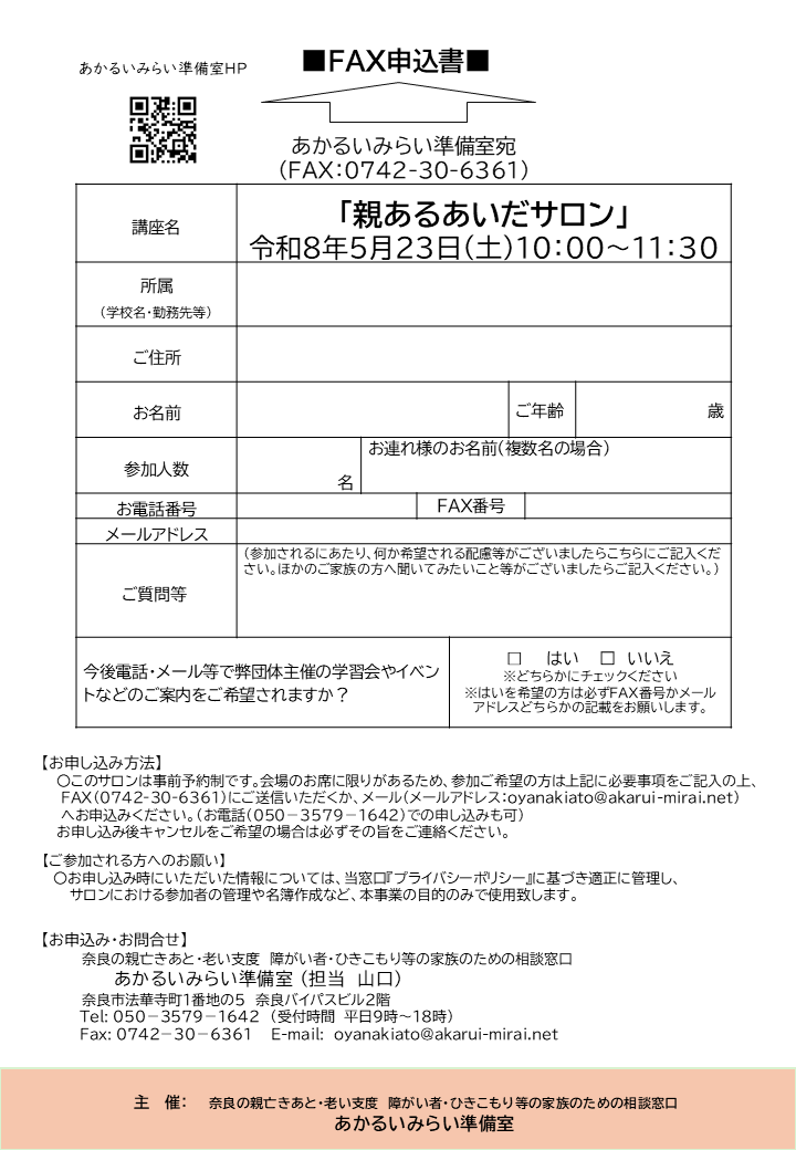 | メッセージ | 〇お申し込み時にいただいた情報については、当窓口『プライバシーポリシー』に基づき適正に管理し、サロンの参加者の管理や名簿作成など、本事業の目的のみで使用致します。 |